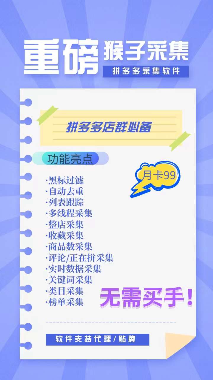 猴子采集功能亮点:无需买手号,整店采集,实时采集,推荐采集,小编推荐,人工鉴图,类目采集数