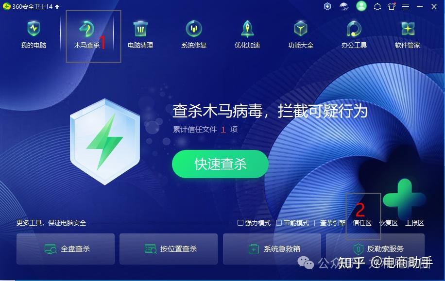 首先我们打开360安全卫士选择“木马查杀”-“信任区”-“添加目录”选择您要添加的文件(注意这个文件夹是要将软件解压到的哪个文件夹)既可以。