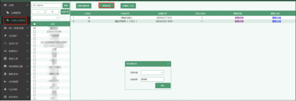 在【店铺分组管理】栏目下点击“新增分组”,为店铺增加分组名称。