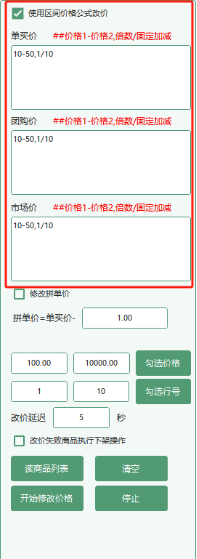 可以选择适用价格公式进行改价,这里解释下公式的意思,1-50,1/10指的是系统自动选取单买价为1至50元的商品,进行改价,比如商品的单买价格为30元,那么改价后的单买价就是(30*1+10)=40元