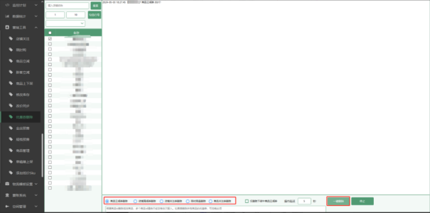 商家可在【营销工具】-->【优惠券删除】下对优惠券进行批量删除,首先先选择删除的优惠券类型,点击“一键删除”,系统自动对优惠券类型进行删除